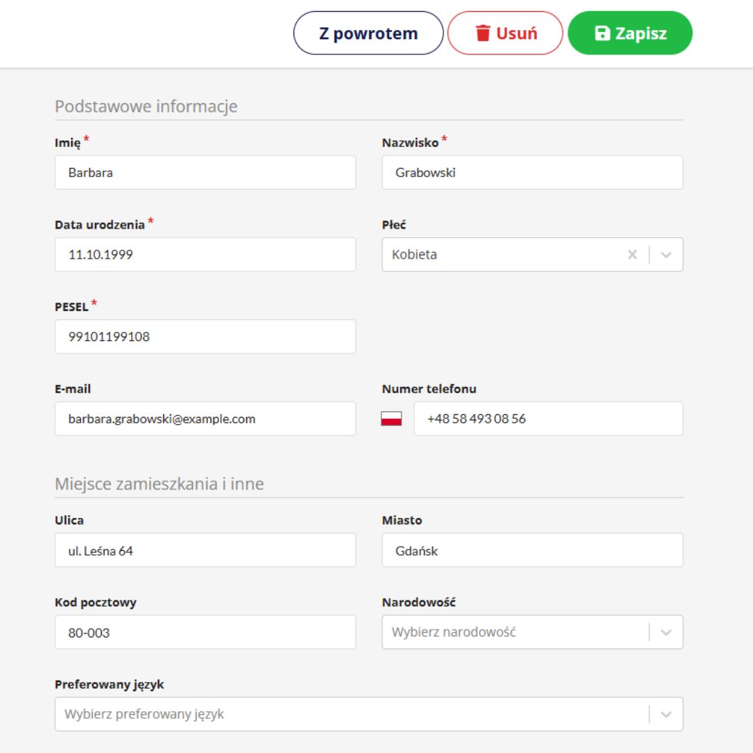 Tożsamość pacjenta jest weryfikowana m.in. na podstawie numeru PESEL oraz zgodności zweryfikowanych danych kontaktowych, co daje pewność, z kim rozmawia gabinet. Dodatkowo PESEL można skopiować jednym kliknięciem, aby szybciej odszukać pacjenta w głównym EDM.