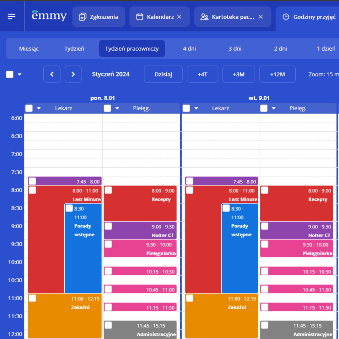 Rejestratorka może łatwo sprawdzić godziny przyjęć, a sama Emmy oferuje dostępne terminy dla pacjentów w zależności od rodzaju wizyty. Terminy można ustawiać z dokładnością co do minuty.